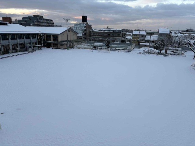 2枚目は朝です。朝一は空気がしんとはりつめていて、一面の銀世界でした。美しいですね。思わずとびこみたくなりましたが、子どもたちに味わってほしいので、キレイなままにさせていただきました。学校に来た子どもたちから、どんどん運動場にきて、雪遊びに没頭する様子がたくさん見られました。雪に反射する光と子どもたちの笑顔で眩しく感じました。そして何よりとても楽しそうでした。中間休みには外に出させてもらいましたが、学年に関係なく攻撃してきてくれました。全力でお相手させていただきました。楽しいですね。お昼にはドロドロになってしまい、遊べなくなってしまいましたが、ちょっとしかその機会がないからこそ、思い出として際立つのかもしれませんね。
