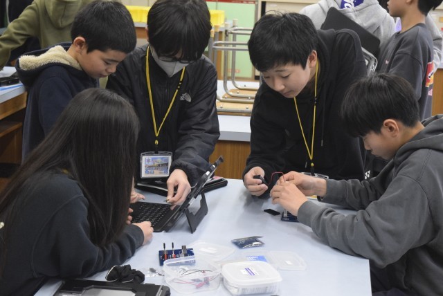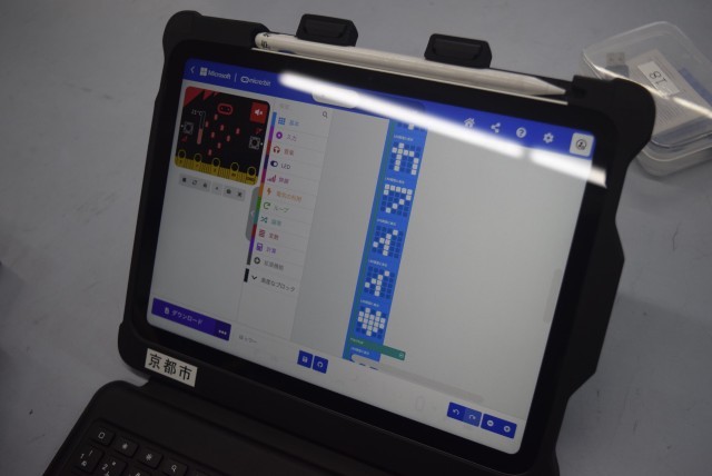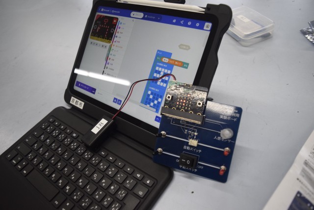 ということで、論より証拠。人の動きを感知したら画面が光るというプログラムを作ってもらいました。マイクロビットというものを活用し、命令のブロックを正しく構築すると、そういったことが可能になります。使用にあたっての手順も含め、子どもたちの吸収力と思考力、そして発想力に驚かされました。暗さや温度を条件に設定したり、点灯の仕方を工夫したりするなど、とても興味深かったです。