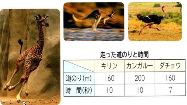 です。この資料を渡してすぐに子どもたちは、1番は分からないけど、比べられる生き物がいることに気づいていました。するどいですね。そうです、キリンとカンガルー、キリンとダチョウはすでにどちらが速いか分かります。キリンとカンガルーなら、カンガルー。キリンとダチョウならダチョウです。しかし1番が分からないので、「1秒あたり」や「1mあたり」という単位量について考えていくと、子どもたちはすぐに1番を発見することができました。前の学習の成果ですね.