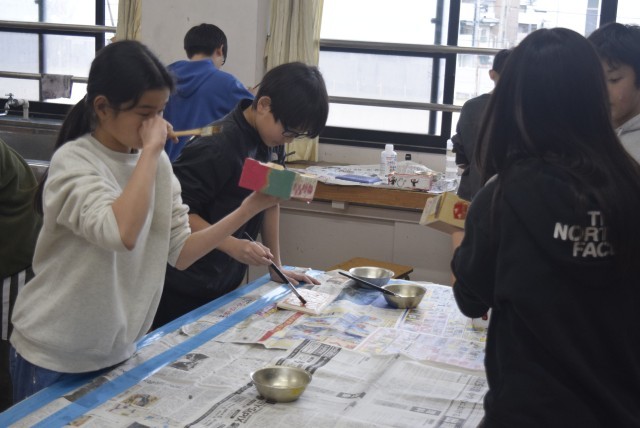 上の一面だけでなく、いろんなところから見ても子どもたちらしさが出るようになっています。彫ったり塗ったりして努力を積み重ねてきた作品がようやく、ニスを塗って完成しかけていました。どうやったらすぐに乾いてくれるか友だちと協力しながら、試行錯誤している姿が印象的でした。危うく外に干されそうになっていました。
