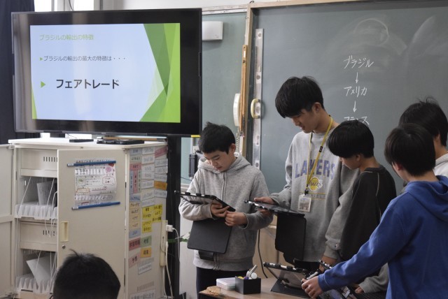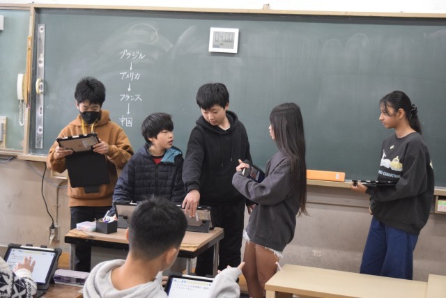 子どもたちは、アメリカや中国をすぐに挙げてきました。そんな中で、「日本とつながりが深い国々の人々とはどのようにつながっているのだろうか」という問いのもと、ブラジル、アメリカ、フランス、中国の4カ国にグループに分かれて調べてみました。