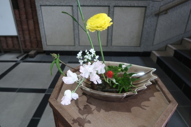 本日、今年度最後の生花教室を行いました。スイートピーやラナンキュラスなど春らしい花材を使って、盛花をを楽しみました。