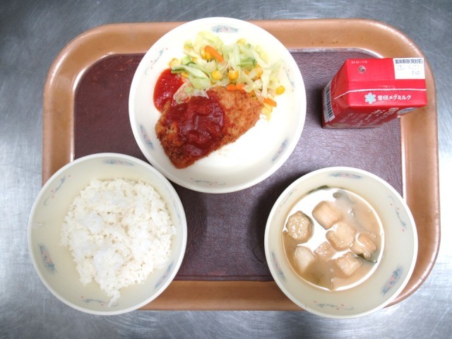 トンカツは、1枚1枚丁寧に衣をつけ、心をこめて油で揚げたものです。かけているソースも、給食室特製の手作りソースです。昨日から楽しみにしていた子もいるほど、待ちに待った献立でした。