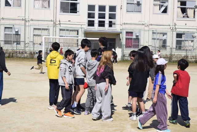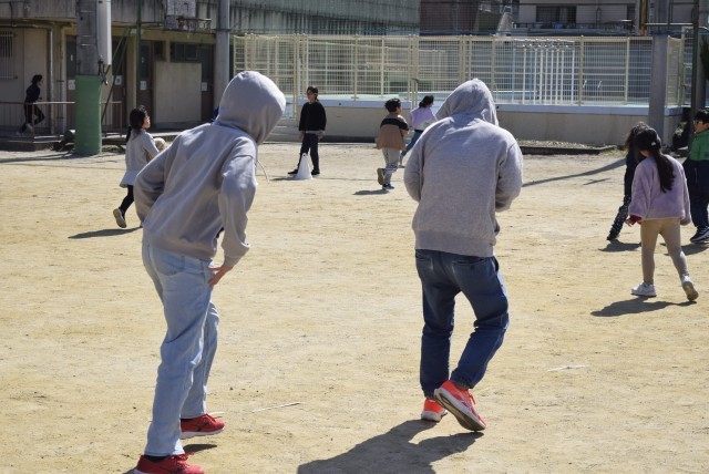 しばらく様子を見ていて、ふとした拍子に、見覚えのないシルエットの子どもを見つけました。誰かと思えば6年生の1人でした。この短時間で急激に体が発達したわけではなく、服を何着も着こんでいたのです。いきなりの姿とそのアイディアに思わず笑ってしまいました。ノリノリの本人、それに協力する友だちたち。鬼ごっこ中であるとはいえ、みんなでさまざまな楽しみ方をしていました。