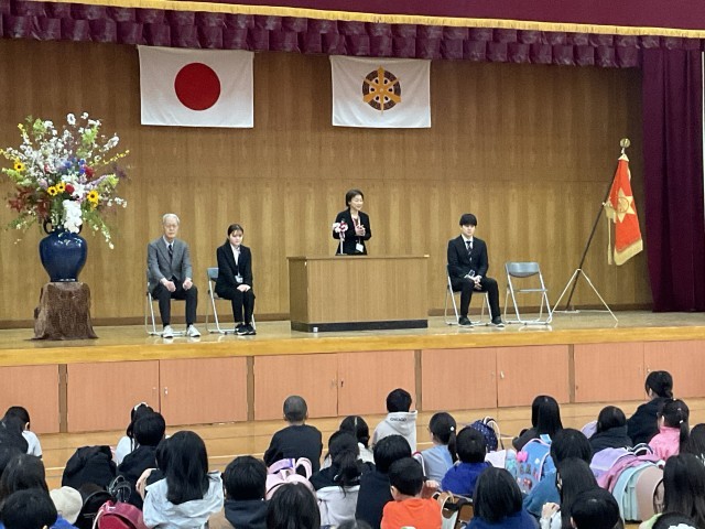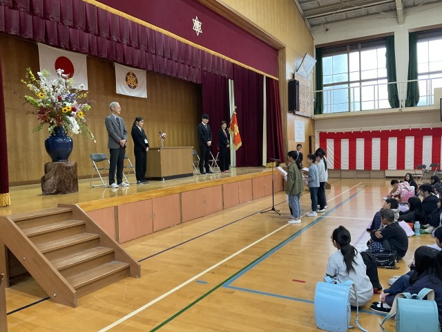 (写真は、新しい教職員をお迎えした着任式の様子です。新6年生代表の児童が、とても楽しいお迎えのメッセージを送ってくれました。)
