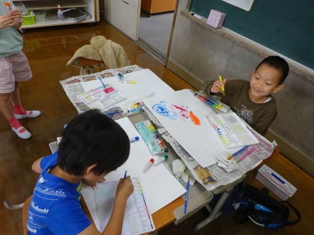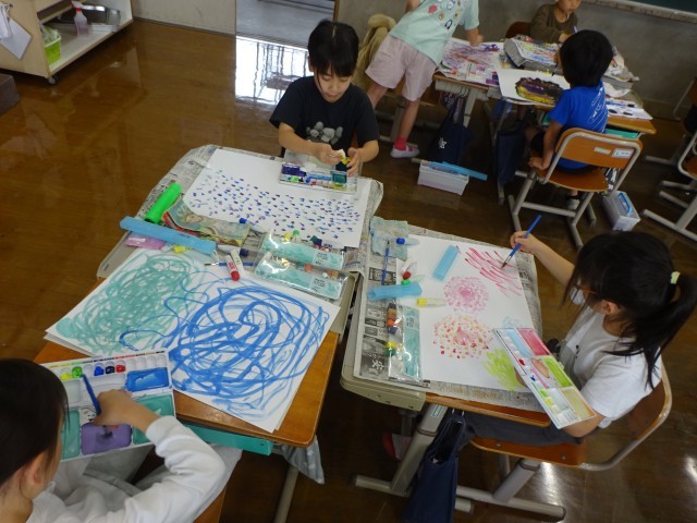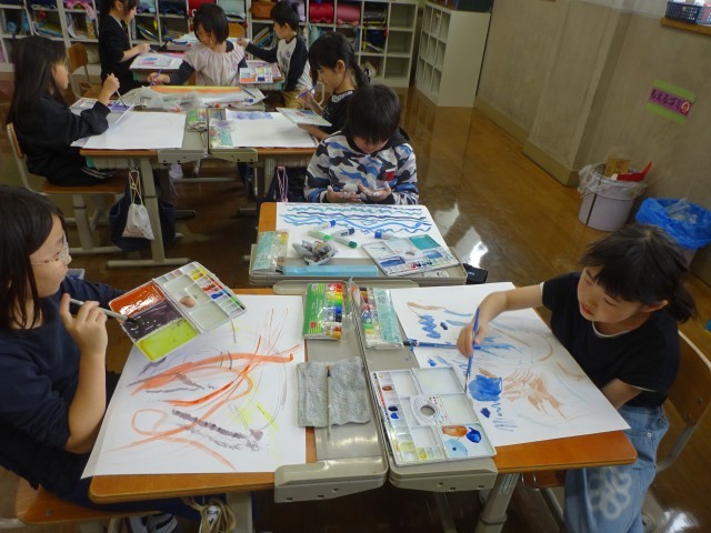 いろいろな太さの線を描いたり、ぐるぐる渦を巻いたり、点々を並べたり、グラデーションを付けたり・・・大きな画用紙にいろいろな色が溢れる、素敵な作品ができました。