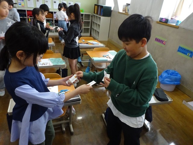 「Hello, I'm ~.」と言いながら、名刺を交換することが上手にできていました。