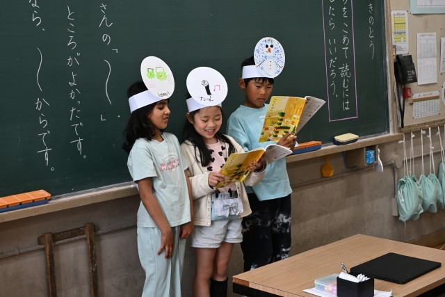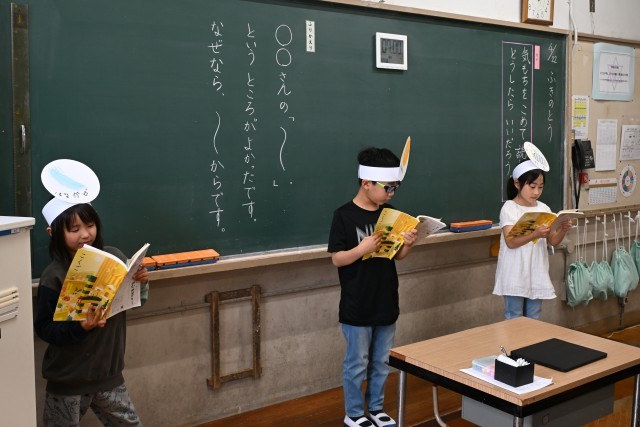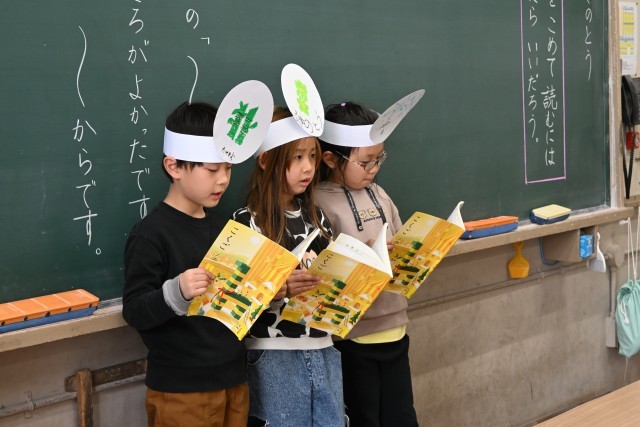 子どもたちは、国語科で学習を積み重ねてきた「ふきのとう」の音読発表に取り組みました。「『よいしょ、よいしょ、おもたいな。』は『小さな声がしました。』って書いてあるから、小さな声で読みます。」、「『ささやいています。』って書いてあるから、ささやくように小さな声で読みます。」、「はるかぜをおこさないといけないから、大きな声で読みます。」と、教科書に書いてあることをもとに音読の工夫をそれぞれに考えてから本番の発表に臨みました。どのグループも、スラスラ・ハキハキと音読できていてすごいなと感心しました。
