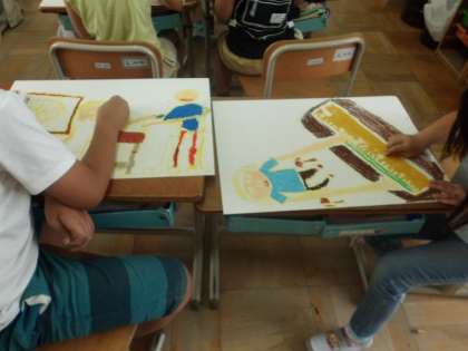 算数の学習で初めて「30cmものさし」の使い方を勉強した2年生。センチやミリの長さの単位があることを知り,その学習も生かしながら,何かを計測しているところを描きました。