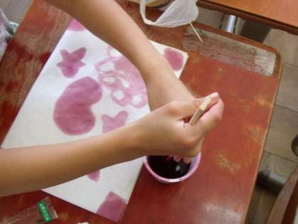 ビニール袋に集めた花を入れてよくもんでいくと,色水がどんどんできていきます。みんなキャーキャー言いながら何度ももんで,色水をカップに移し,和紙を染めていきました。割り箸をもってきた子どもは,わりばしで模様を描いています。