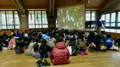雨が降ったので,午前の山の散策をやめて,オリエンテーションホールで花背に暮らす生き物や植物のスライドを見ています。