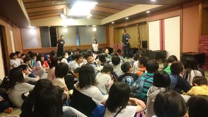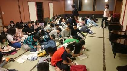 お風呂から上がり,レクレーションタイムです。名古屋に関する問題を班で協力して考えています。 その後,1日の振り返りをして就寝しました。