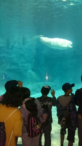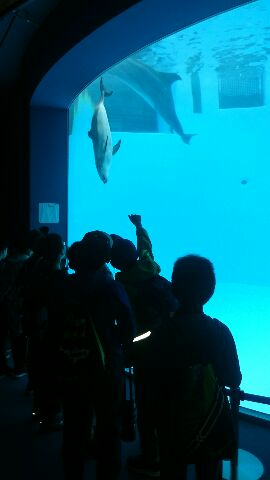 水槽に近づいて,目を真ん丸にしながら釘付けになって見学している子どもたちです。