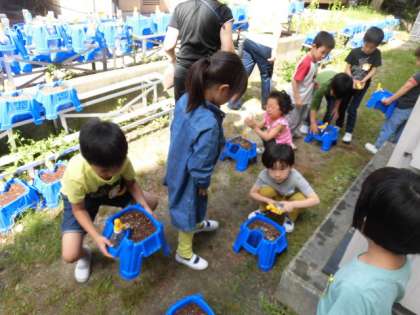 アサガオの種まきをしました。自分の植木鉢に種を5つまきました。