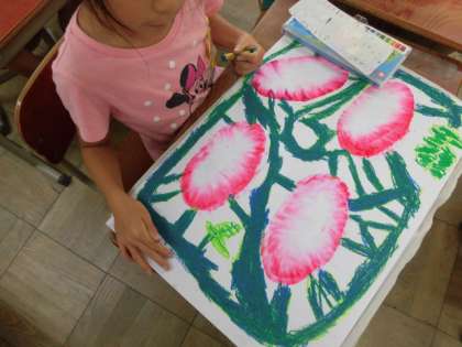 色とりどりの花の周りに,蔓と葉を描いて完成させました。作品を並べると,とても華やかです。掲示するのが,楽しみです。