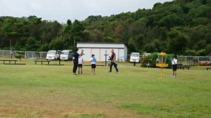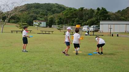 バッタを捕まえようと挑戦したり,今日は風が穏やかなのでフライングディスクゴルフをしたり,それぞれに楽しんでいます。