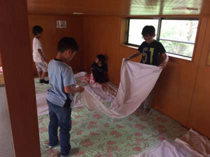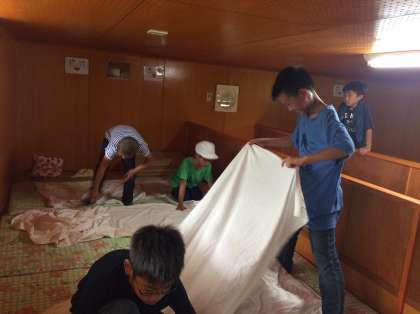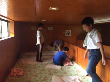 今夜は,男子がバンガローで宿泊し,女子が90畳の広い部屋で過ごします。