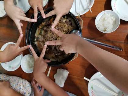 おいしそうですね‼ 思わず,ピースで協力をしたことを表して「星型」を作った子どもたちです。頑張った分,力を合わせた分,最高においしいすき焼き風煮の完成です。