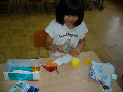 図画工作では,引き続き「ゴーゴードリームカー」の制作中です。集中して,色画用紙を切って貼っていきます。真剣です。