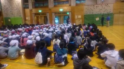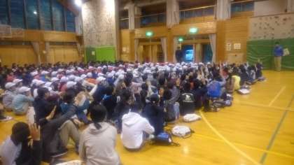 今日の朝のつどいは,宿泊している4校合同で行われました。互いに,自分たちの学校の紹介をしました。