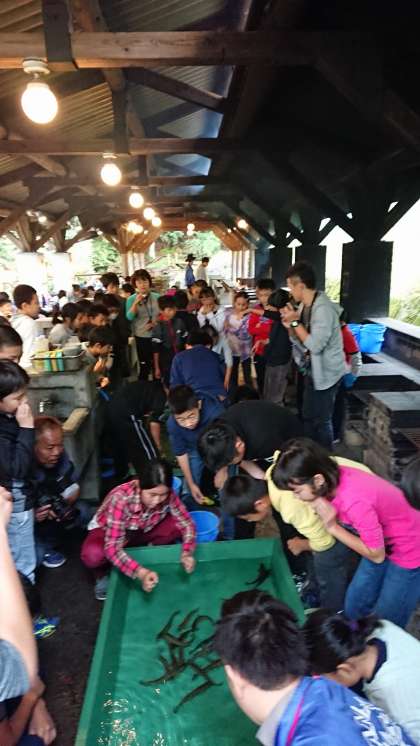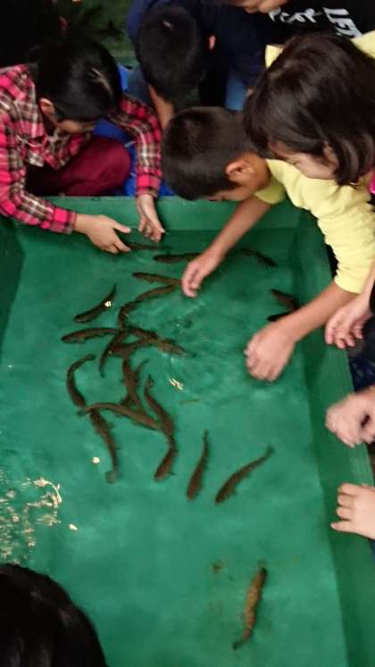 魚つかみの活動です。元気いっぱいに泳ぐの魚をつかんで,さばいて命をいただく活動です。私たちの命は,多くの命に支えられているのですね。みんな,真剣に参加しています。
