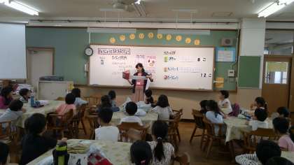 給食前の食の学習では,牛乳にたくさんのカルちゃん(カルシウム)が含まれていることを視覚的に分かりやすく教えていただきました。牛乳の箱からカルちゃんがどんどん出てくる様子に,子どもたちはびっくり。歓声を上げていました。
