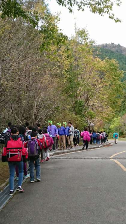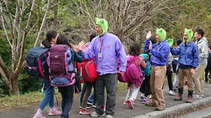 山の家の職員の方々が,花背山の家のマスコットキャラクター「ハナコロ」に扮して,見送ってくださいました。