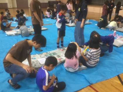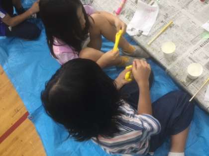 子どもたちは,自分の好みの色のスライムを作って,大はしゃぎ。サークル「どろんこ」のお兄さん,お姉さんに助けてもらいながら,色を混ぜて自分好みのスライムを作っている子どももいました。
