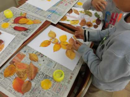 11月に入り,周りの様子が秋らしくなってきました。生活科では,「あきといっしょに」の学習を始めています。この日は,学校の落ち葉を拾って,絵を描く活動をしました。赤や黄色の葉っぱを魚の形にしたり,花の模様にしたり,自分のおもいに合わせて作品作りを楽しんでいました。
