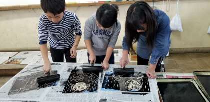 ローラーでインクをよく練って,版木にうつして…と,初めての作業でしたが自分達で丁寧に刷ることができました。