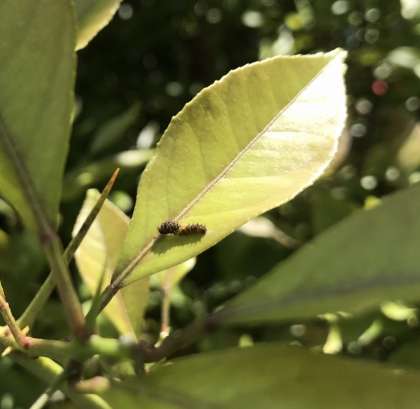 この前はモンシロチョウの「たまご」と「よう虫」を見つけました。このホームページで紹介するために,「ほかにもいないかな…。」と思ってさがすと,今日はレモンの木にアゲハのよう虫がいました。