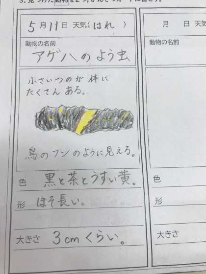 今日は「アゲハのよう虫」を見つけたので,みんなに知らせたいと思って「かんさつカード」にかきました。ぜひ見てください。