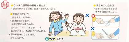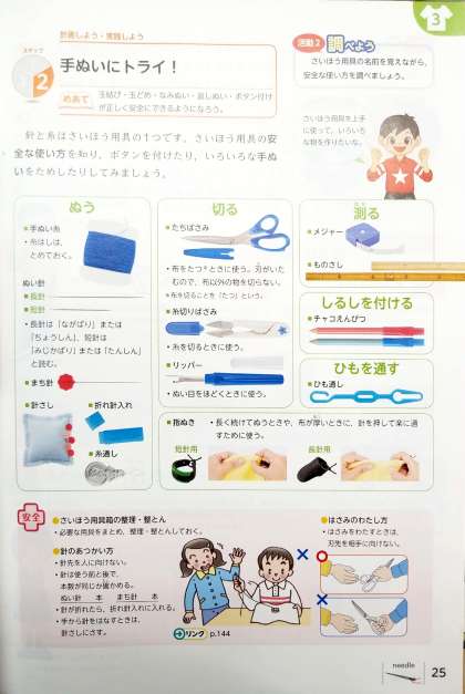 家庭科の教科書P24〜31「ひと針にこころをこめて」には,安全な使い方や,手ぬいの手順などがのっています。