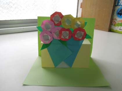 先生は,お花が好きなので,開くと花束が飛び出すしかけにしようと思いました。