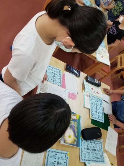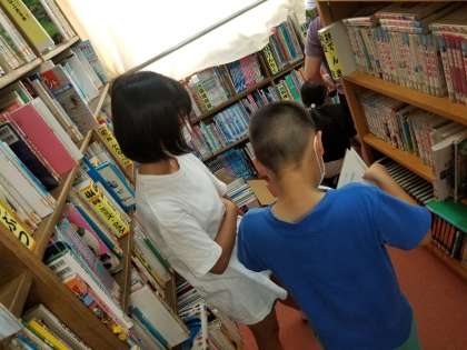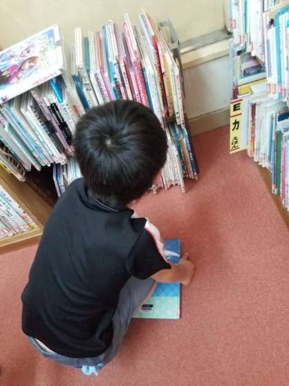 班ごとに,フルーツ,いるか,学校…などとテーマを決めてみんなで本を探すと,一つのテーマでもたくさんの分野の本があることに気がつきました。