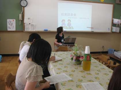6月25日(木)に,PTA保健委員会主催で,給食試食会を行いました。学校長あいさつの後,栄養教諭から「学校給食について〜今日の給食を通して〜」「子どもたちの食生活について〜給食時間の様子を通して〜」「学校での食の指導について〜朝ごはん〜」のお話がありました。給食参観の後,今日の給食を試食しました。給食は,麦ごはん・牛乳・さんまのかわり煮・だいこん葉のごまいため・すまし汁でした。