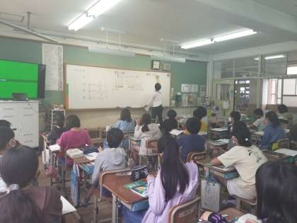 今日は,算数協力指導の先生と一緒に明日からの学習にむけて「分数×整数」「分数÷整数」の学習の復習をしました。