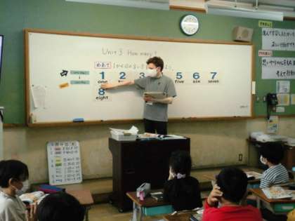 3年生の外国語活動「How many」では,1〜20のまでの数の言い方や尋ね方を学習しています。今日は,ALTの先生と一緒に学習しました。