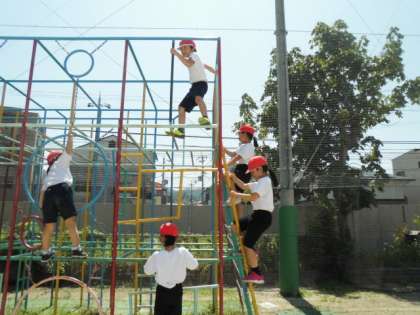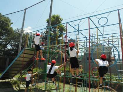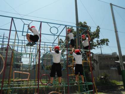 3年生の体育科「総合遊具の安全」では,手と足をしっかり使って,遊具を安全に使うことを学習しています。総合遊具を使う人と,安全に使っているか見る人に分かれて,鉄の棒をきちんとにぎっているかを確認をしました。今後も,安全に気を付けて遊具を使うようにしていきます。