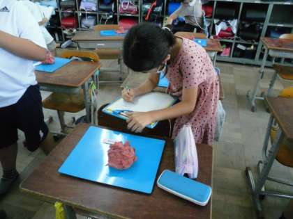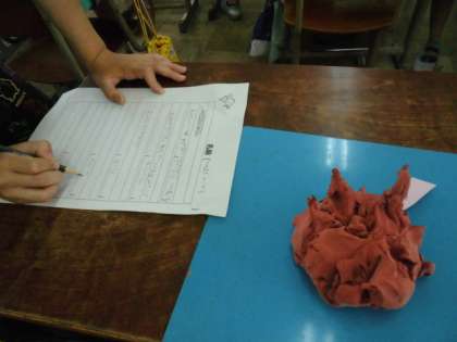 3年生の図画工作科「切って かき出し くっつけて」を学習しました。ねん土で,いろいろな用具を使って,作品を作りました。今日は,友達の作品を鑑賞して,工夫している所を見つけました。友達の作品のよい所をたくさん見つけることができました。