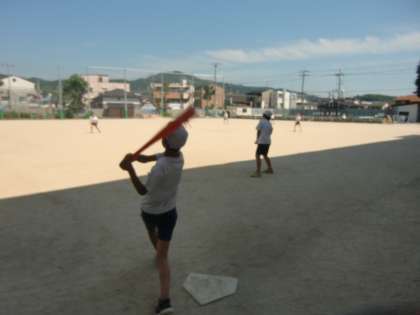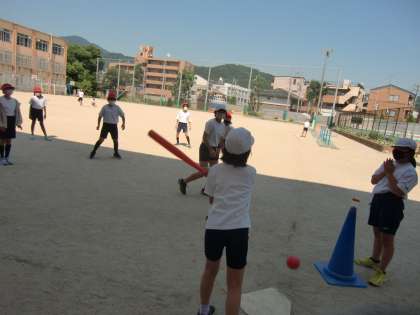 体育科の学習では「ベースボール」をしています。野球好きな子どもも,野球には興味がなかった子どもも,すっかり野球の楽しさにはまっているようで,みんなとても楽しそうにプレイしていて,ヒットが出るたび,得点が入るたびに大歓声を上げています。投げられたボールを打つのが苦手な子どもは,ティーの上にボールを置いて打ちます。子どもたちはこのティーのことを「秘密兵器」と呼んでいます。