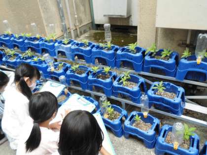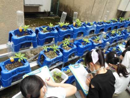 理科の学習で育てている「ホウセンカ」の観察をしました。ヒマワリと同じようにぐんぐんのびているようすを見て,うれしい様子でした。
