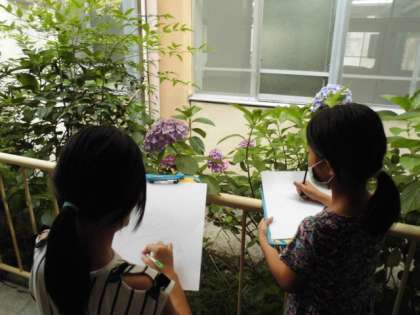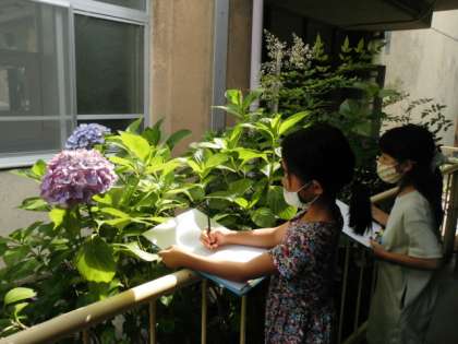 小さい花がたくさん集まっていて,とてもきれいでした。薄い紫や水色など,さまざまなな色の「アジサイ」が咲いていて,どのアジサイを描こうかな,とまよっている子もいました。よく見ると,花によって花びらの形が違うことに気付いている子もいました!!