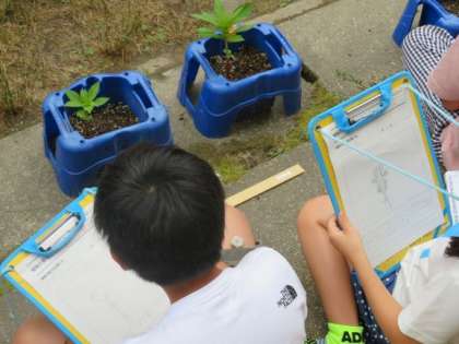 理科の「植物の育ち方」の学習で,育てているホウセンカの観察をしました。
