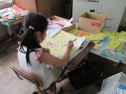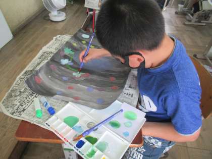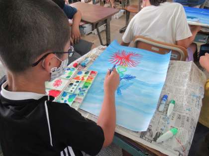 図画工作科の学習で,自分で考えた「まぼろしの花」を描きました。「青空に浮かぶ色とりどりの花」「暗闇に光る花」などイメージを膨らませ,熱心に描き進めることができました。