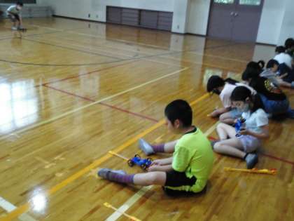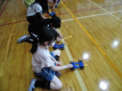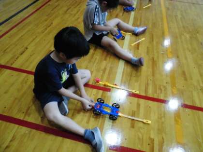組み立てが終わった後,体育館で走らせてみました。「体育館のはしまで走ったよ!」「もっと速く走らせたいな」「ゴムをたくさん引っ張ったらたくさん走るよ。」など話をしながら,何回も試していました。
