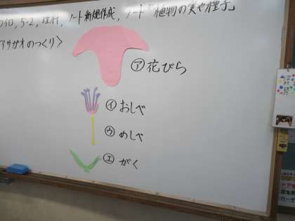 緊急事態宣言中のため,子どもたち一人一人で実験することはできませんが,アサガオの各部分の名称を知りました。
