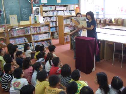 7月9日(木)放課後に,1年生の「よんでよんで」がありました。最初に,聞き方『あいうえお』を確認してから,お話を始めました。中川季枝子文/大村百合子絵 絵本『そらいろのたね』,だいすき!ちいさないきものより高塚博成作/仲川道子画 紙しばい『だんごむしのころちゃん』,A・トルストイ作/砂糖忠良絵/内田莉莎子訳エプロンシアター『おおきなかぶ』の読み聞かせがありました。