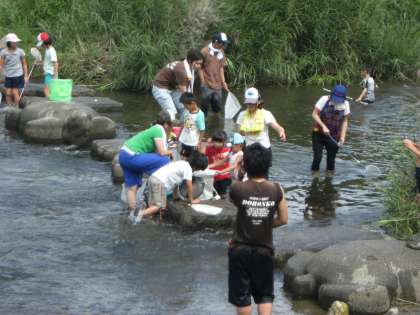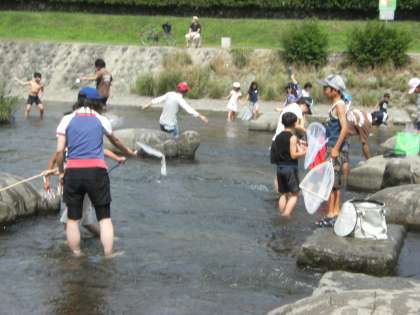 7月11日(土)9:00〜12:00に,10月の土曜学習〜おもしろ大百科〜を行いました。佛教大学サークル「わんぱくグループどろんこ」と一緒に,理科学習として,「高野川・自然観察と川あそび」に行きました。