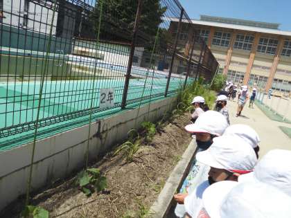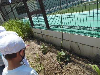 2年生の生活科では,「ぐんぐんそだて おいしいたさい」の学習で野菜を育てています。子どもたちは,かんさつをして「葉っぱがふえているよ。」「花がさいているよ。」とたくさんの発見をしました。支柱を立てたり,肥料をあげたりして,ぐんぐん大きくなるようにしていきたいです。